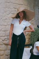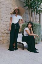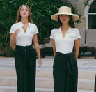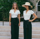 הסט כולל גזרת טופ מחויטת עם מפתח גבוה ופרט צווארון אלגנטי, יחד עם פרימו ארוך וגולש להשלמת מראה קלאסי ומעודן