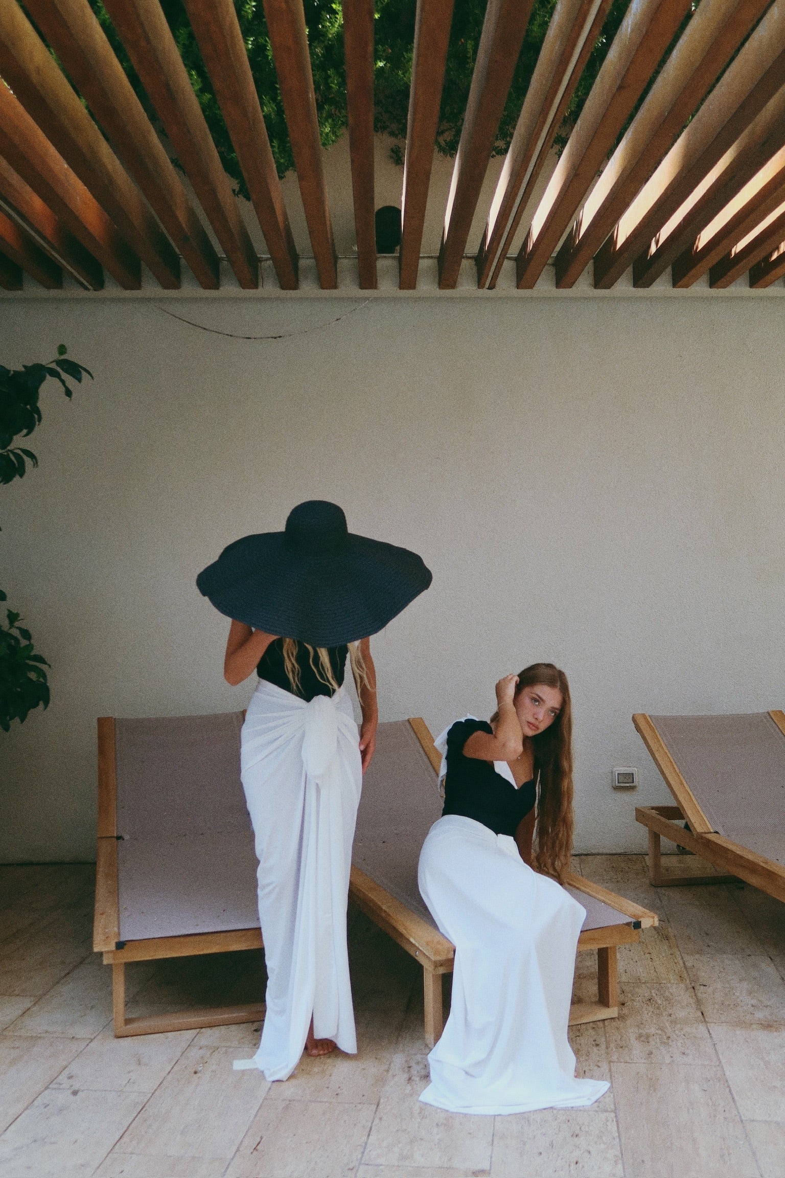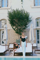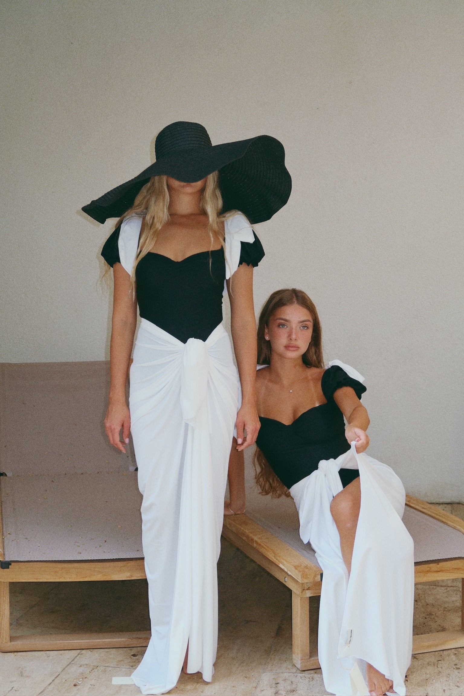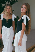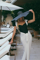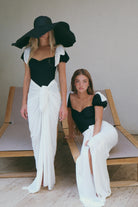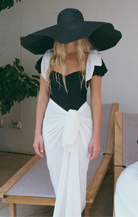 הסט בשחור לבן קונטרסטי כולל חצאית קשירה תואמת בגזרה נשפכת ואלגנטית